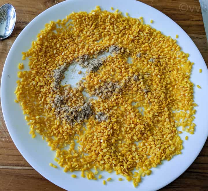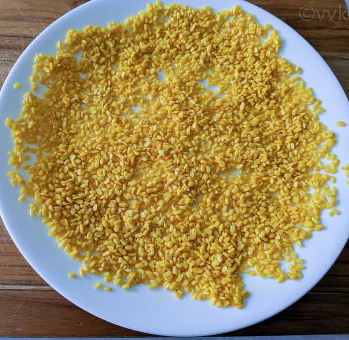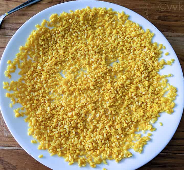 - For ½ cup of moong dal, you need only ½ to 1 tsp of oil. Use any neutral oil or oil of your choice.