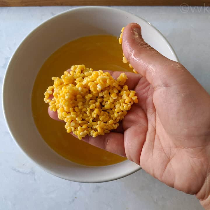 - Rinse the moong dal a couple of times and soak it in atleast 2 cups of water. Add the ground turmeric as well.