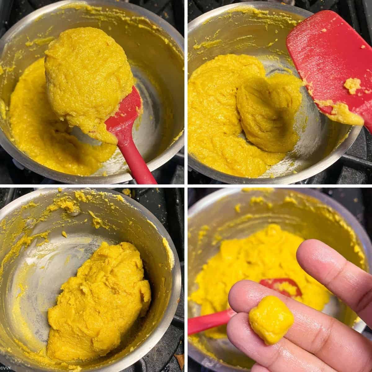 - Consistency check – When the milk powder mixture thickens, and it will come together as one mass. When you drop a blob of milk powder mix, it should fall without sticking in the spatula as shown in the picture; alternatively, you can take a small piece of the burfi mix and let it cool. If you can make a small ball without the mix sticking to your fingers, it is done. If not, cook again by adding little ghee.