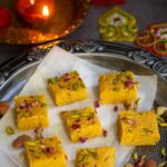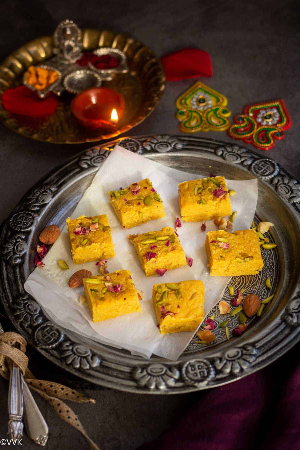 Burfi (also spelled as barfi) is a milk-based sweet more like a fudge. When we talk about Indian sweets or mithai, we can’t skip burfi. There are different types of burfi, and not all burfi recipes are made with milk powder. Besan burfi, yet another popular burfi, is prepared with chickpea flour. Similarly, you have burfi with cashews, almonds, and more. Check out 7 cup barfi which is made with assorted ingredients.