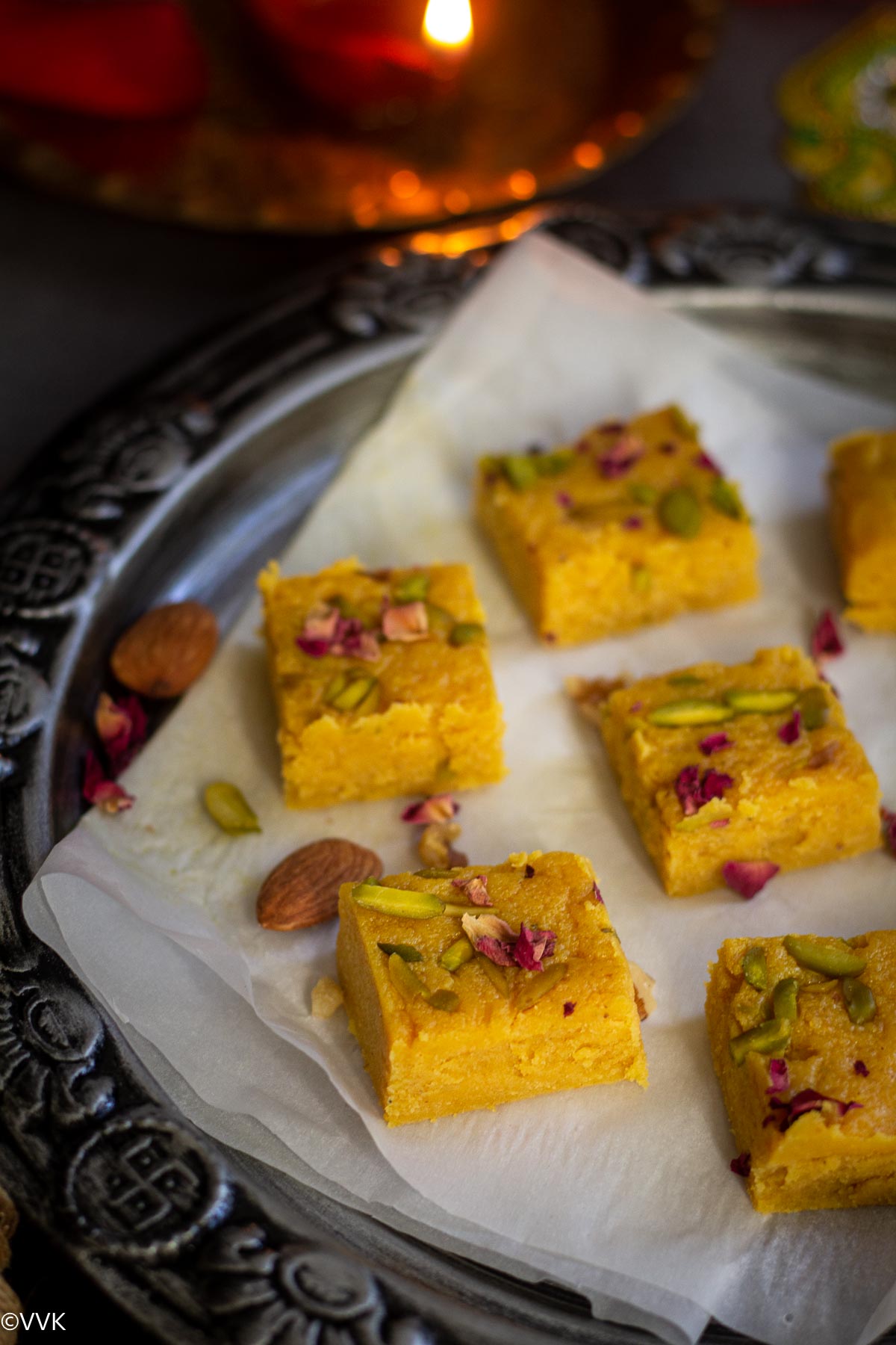 This is a delicious one! Pumpkins adds a beautiful color to the burfi.