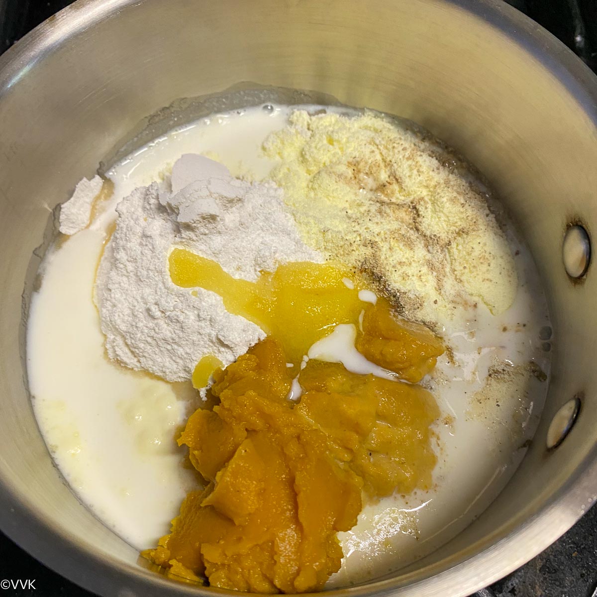 - In a heavy-bottomed saucepan or kadai, add the milk powder, milk, powdered sugar, pumpkin puree, ground cardamom, and one tbsp of ghee.