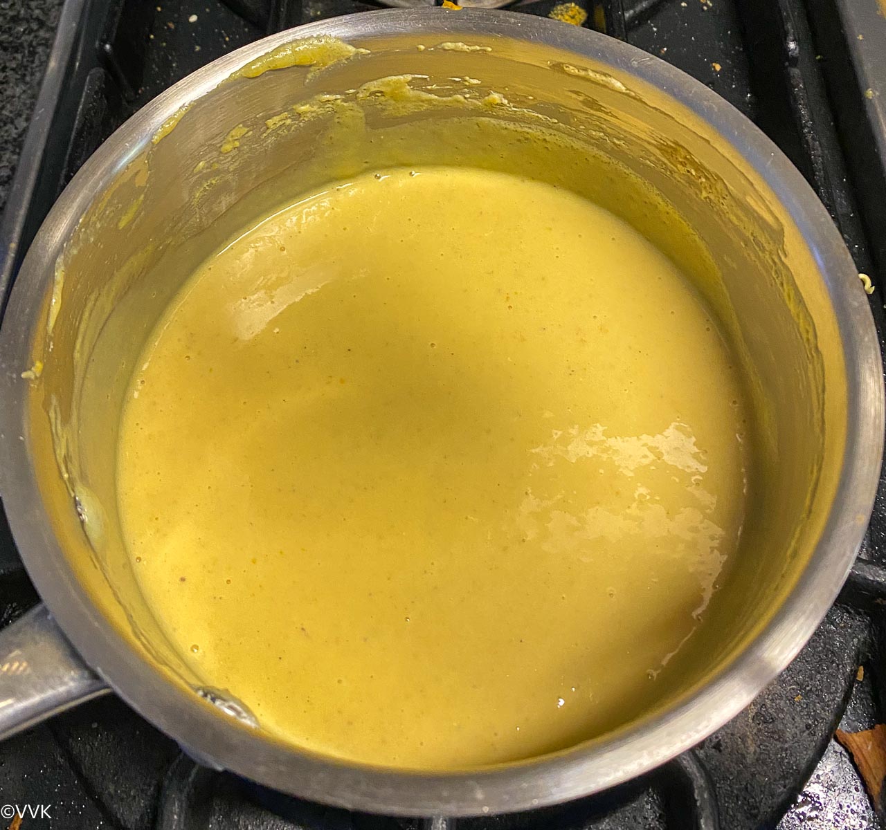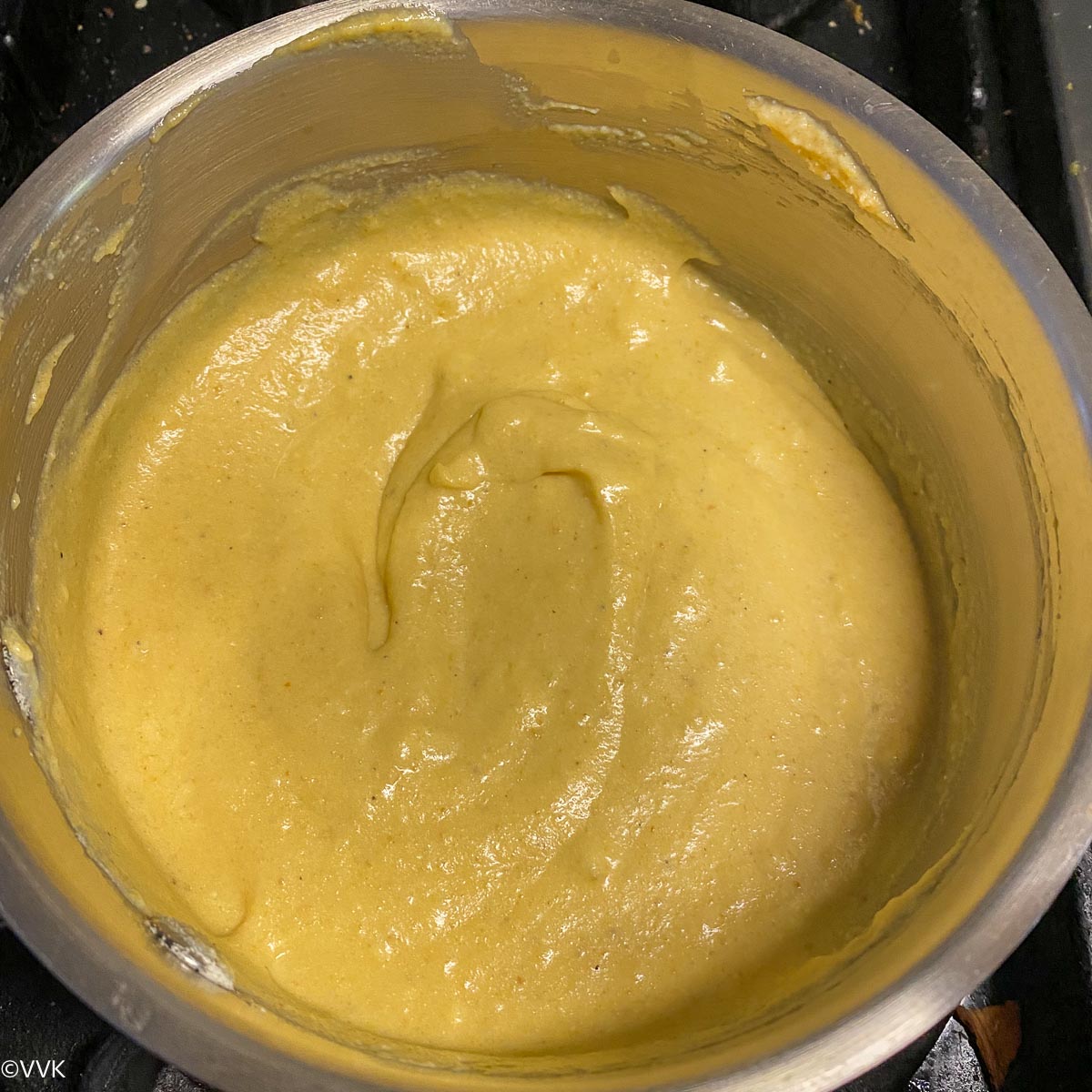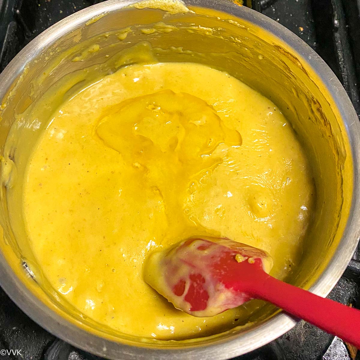 - Now reduce heat further (on a number scale to 2 or 3) and cook the mixture for 8 to 10 minutes (timing might vary, please see the consistency check below) until it thickens. Please do not leave it unattended. Keep stirring at regular intervals.