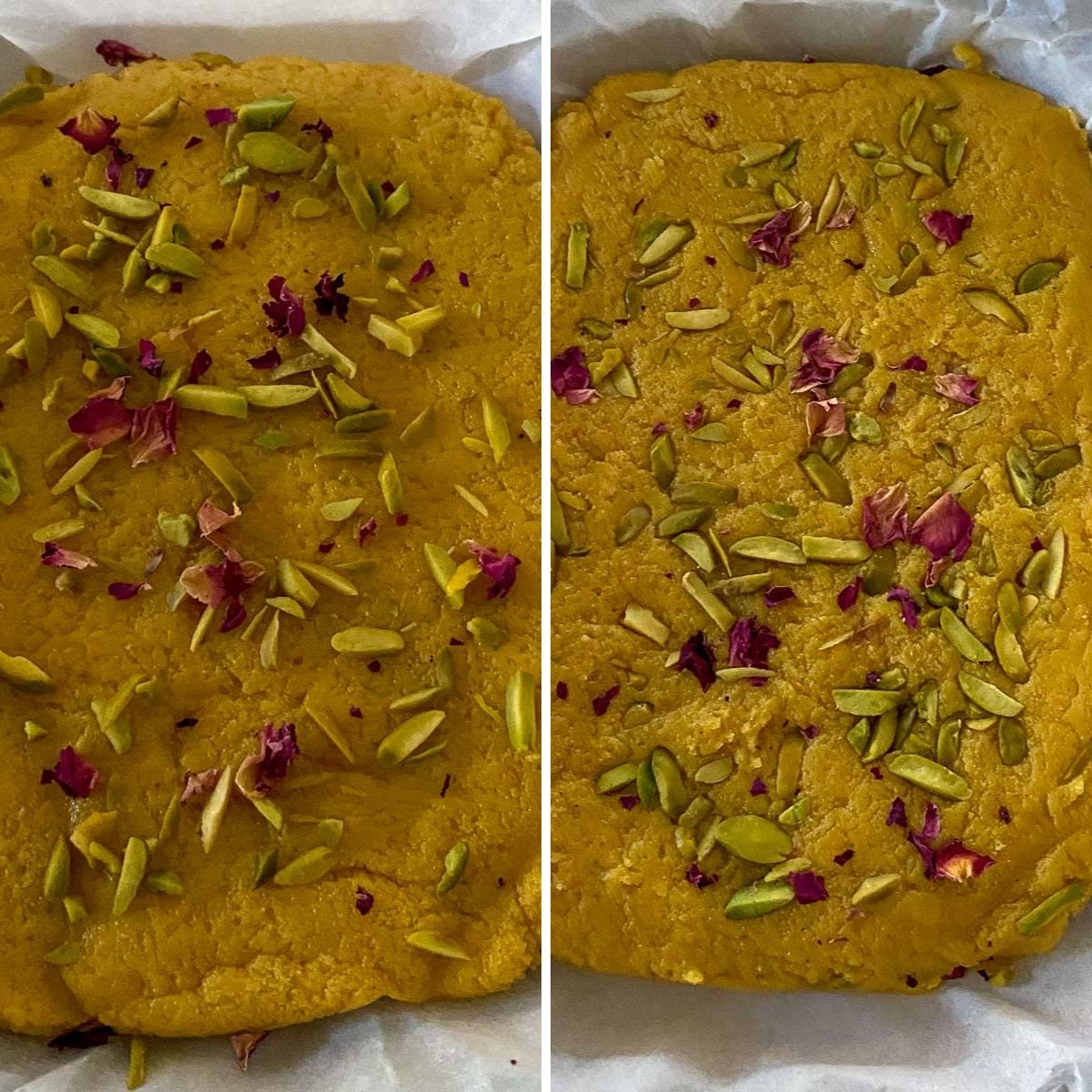 - Now transfer it to a plate or cake pan lined with parchment paper and spread it evenly or per the desired thickness. Sprinkle the nuts and rose petals and press them gently. Let it cool for 60 to 90 minutes. The slice the burfi and enjoy.