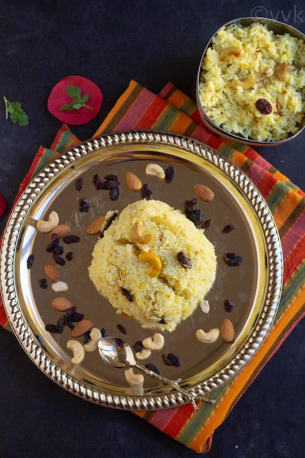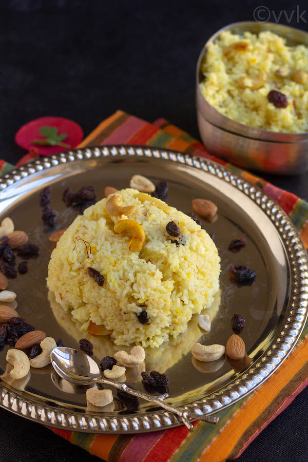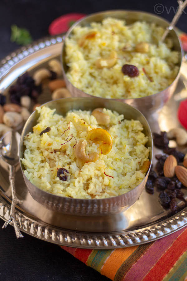 My version is very mild and more like a dessert pulao. You can drizzle some diluted condensed milk and add a dollop of ghee and serve this as a dessert.