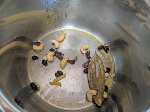 - Then add the cashews, raisins and saute for 20 seconds. Immediately, add the bay leaf, cinnamon stick, cardamom, ginger, and cloves. Cook again for 20 seconds.