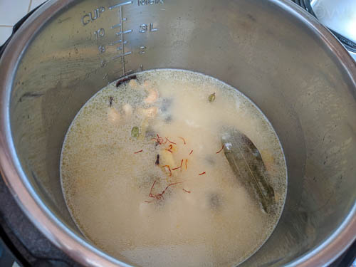 - Add the water and now add the sugar, salt, turmeric, and saffron strands.