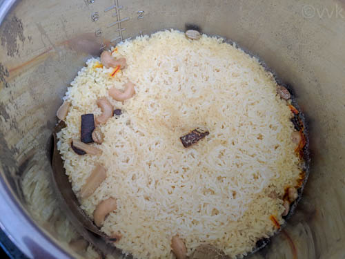 - Carefully open the lid after releasing the pressure and allow the pulav to cool for 5 minutes. Then fluff it up with a fork.