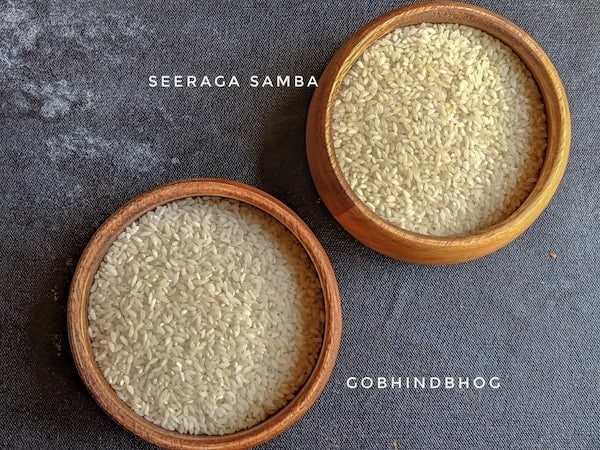 When I found GobindBhog rice here in the Indian groceries, I happily picked one. I know for sure I can use it for kichadi, pulavs, and regular cooking also. After buying it, I took a picture of both seeraga samba and Gobind Bhog and as you can see it is quite hard to differentiate them. :-)
