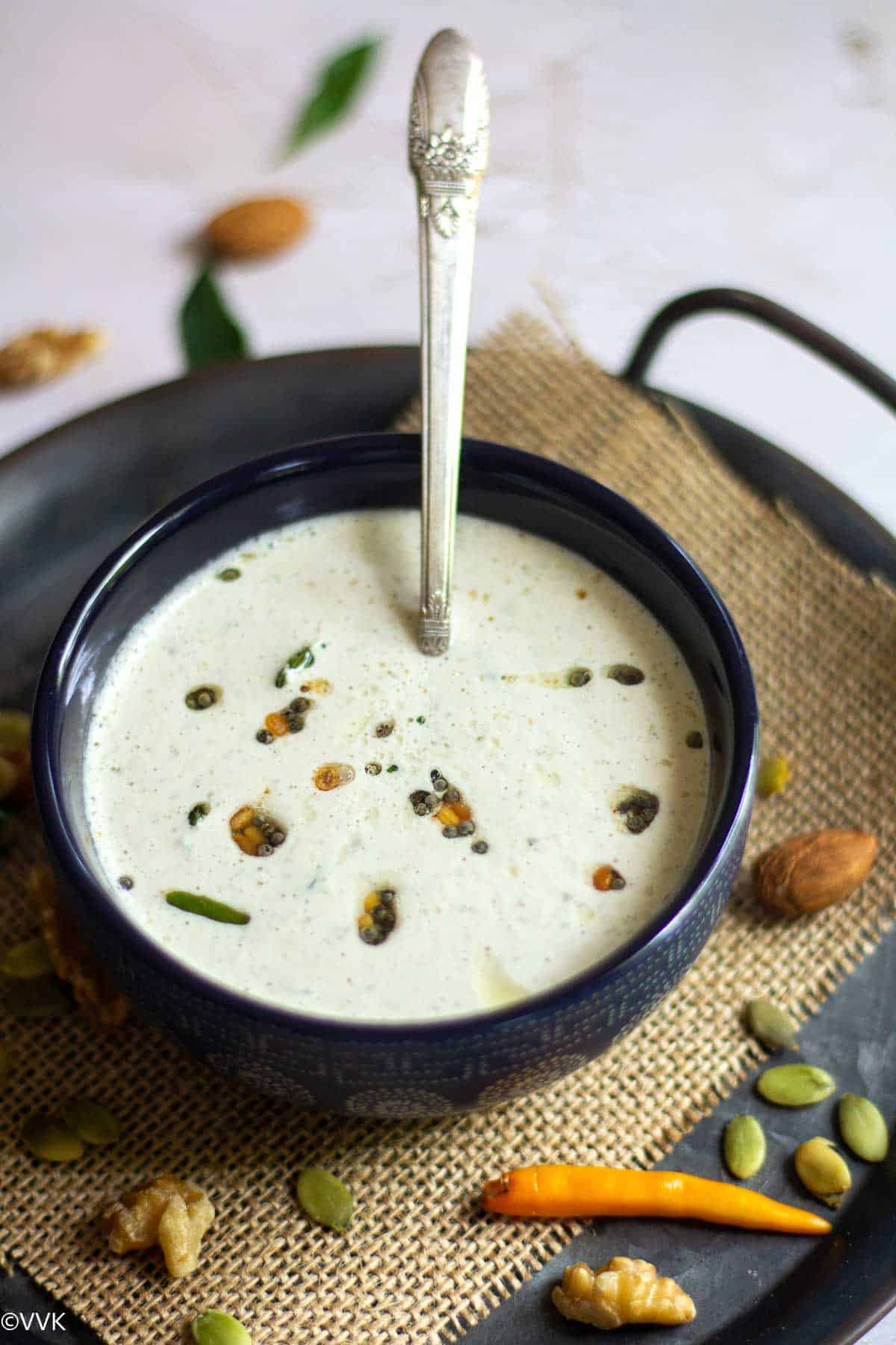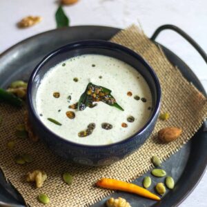 Creamy and delicious South-Indian style coconut chutney with mixed nuts – almonds, walnuts, hemp hearts, and pepitas! A perfect and healthy side for idli, dosa, and many other tiffins.