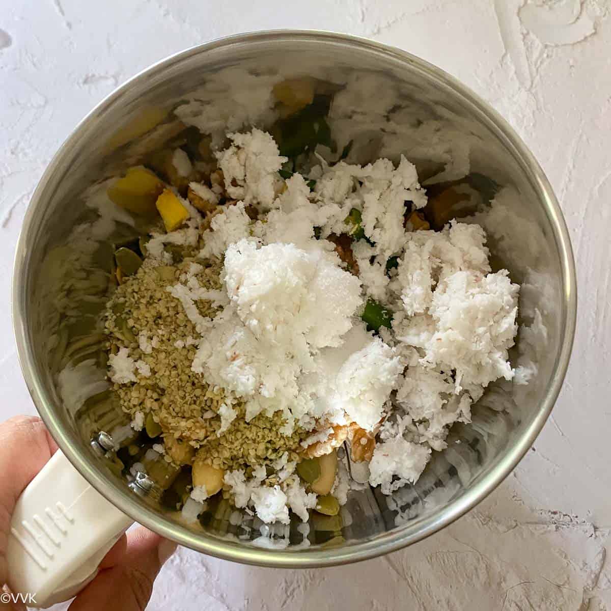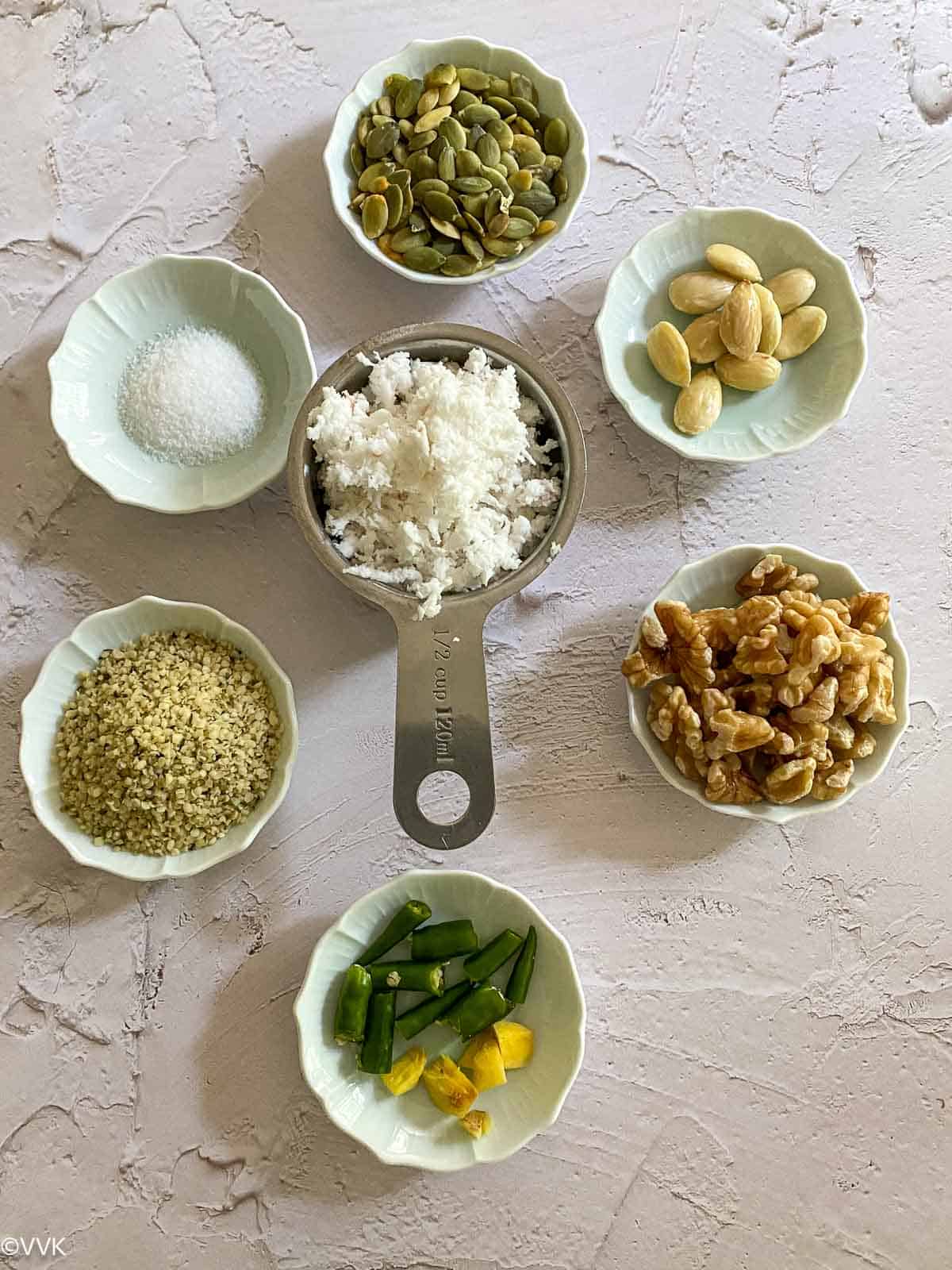 - Add all the ingredients – peeled almonds, soaked walnuts, pumpkin seeds, hemp hearts, ginger, green chili, coconut, and salt into a mixer jar. Without adding any water, grind the ingredients. It will be in a coarse consistency like below.