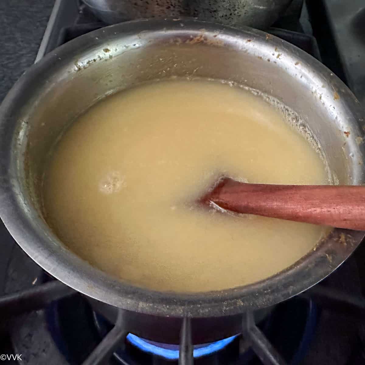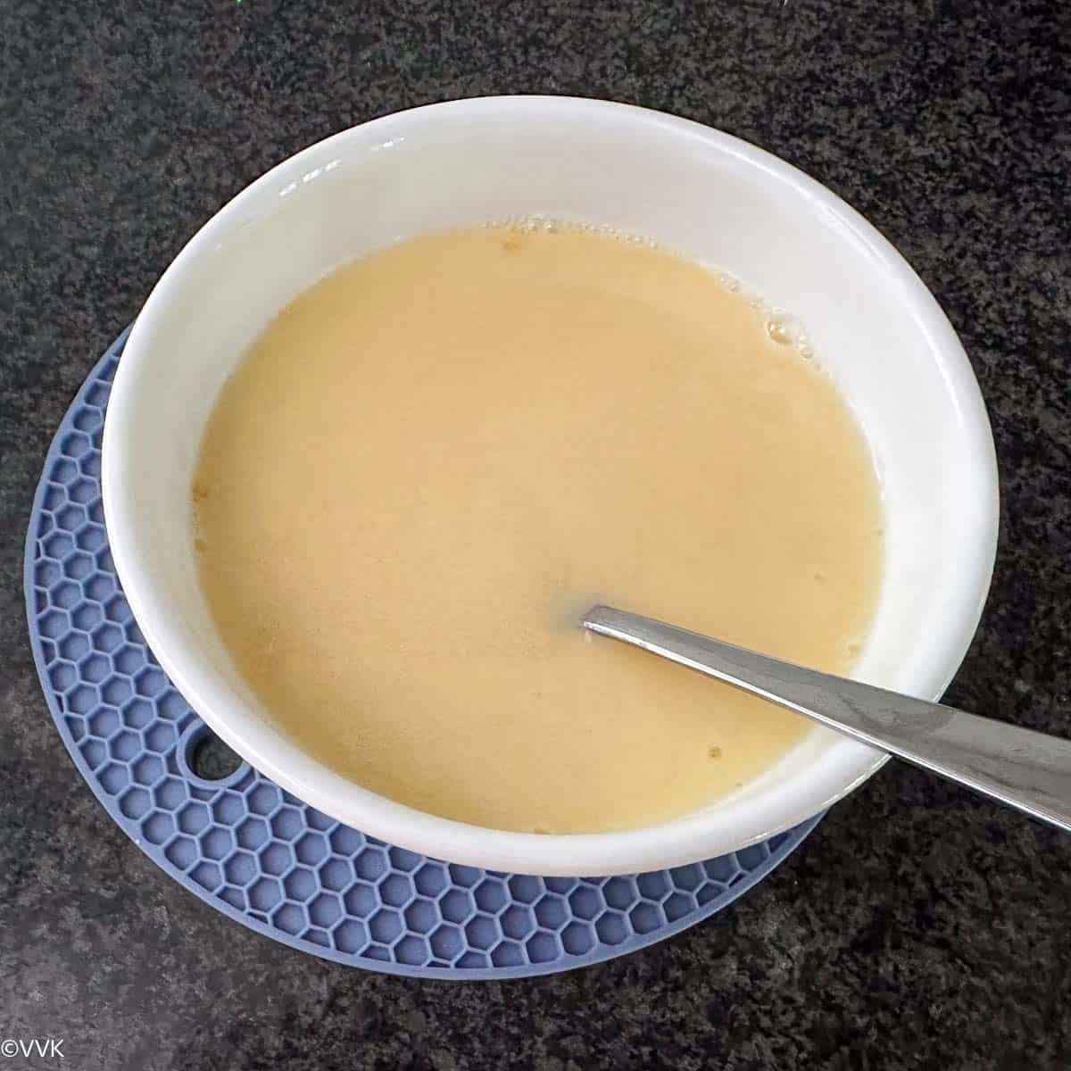 - Mix the 2 tbsp of besan with 1 cup of water without any lumps and set it aside.