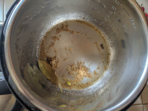 - Now add the bay leaf, cardamom, cinnamon, cloves, cumin seeds, and hing. Let it sizzle for 30 seconds.