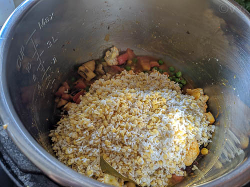 - At this stage, drain the water from the rice and dal and add it to the vegetable mix.