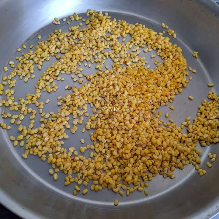 - Don’t need to let it turn red. Just roast it till you get the aroma. If you like roasted moong dal like me, roast it for 4 to 5 minutes like how I did for my sakkarai pongal. But that’s optional.