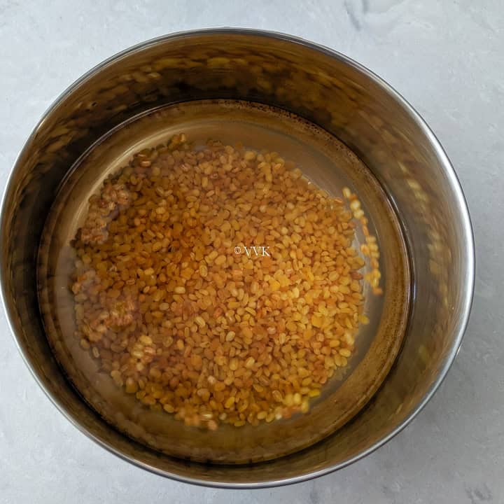 - Soak the roasted moong dal in 1.5 cups of water for 20 minutes. This step is optional. If you are going to pressure cook the moong dal, skip this soaking part. Check the recipe notes for pressure cooking the dal.