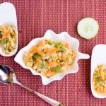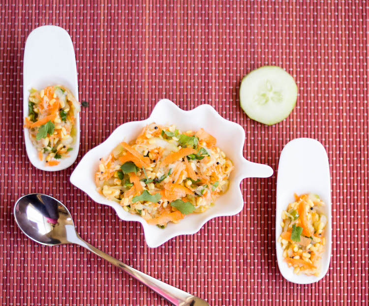 Moong Dal Kosambari is a crunchy South Indian salad prepared with yellow moong dal (split yellow mung), grated vegetables like cucumbers and carrots, and then tempered with mustard seeds.