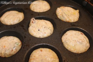 - Fill ¾th of the kuzhi’s with the batter. You need that space because the paniyaaram will rise.