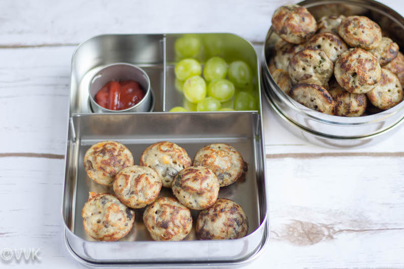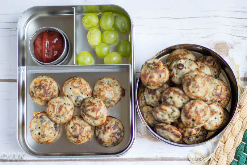 Today I am going to share yet another lunch box recipe with a veggie sneaked in. :-) Yesterday I posted ridgegourd rice, and today it’s the protein-rich Mushroom Paniyaram – a delicious and mess-free lunch box recipe that Vaandu loves!