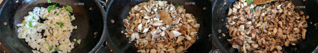 - Then add the chopped mushroom and all the spice powders (garam masala, pepper powder, dagad phool powder) and salt.