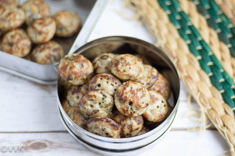 - This paniyaram takes a bit longer to cook when compared to the regular paniyaram. After flipping and after 45 secs, you can insert a toothpick to check if it’s cooked.