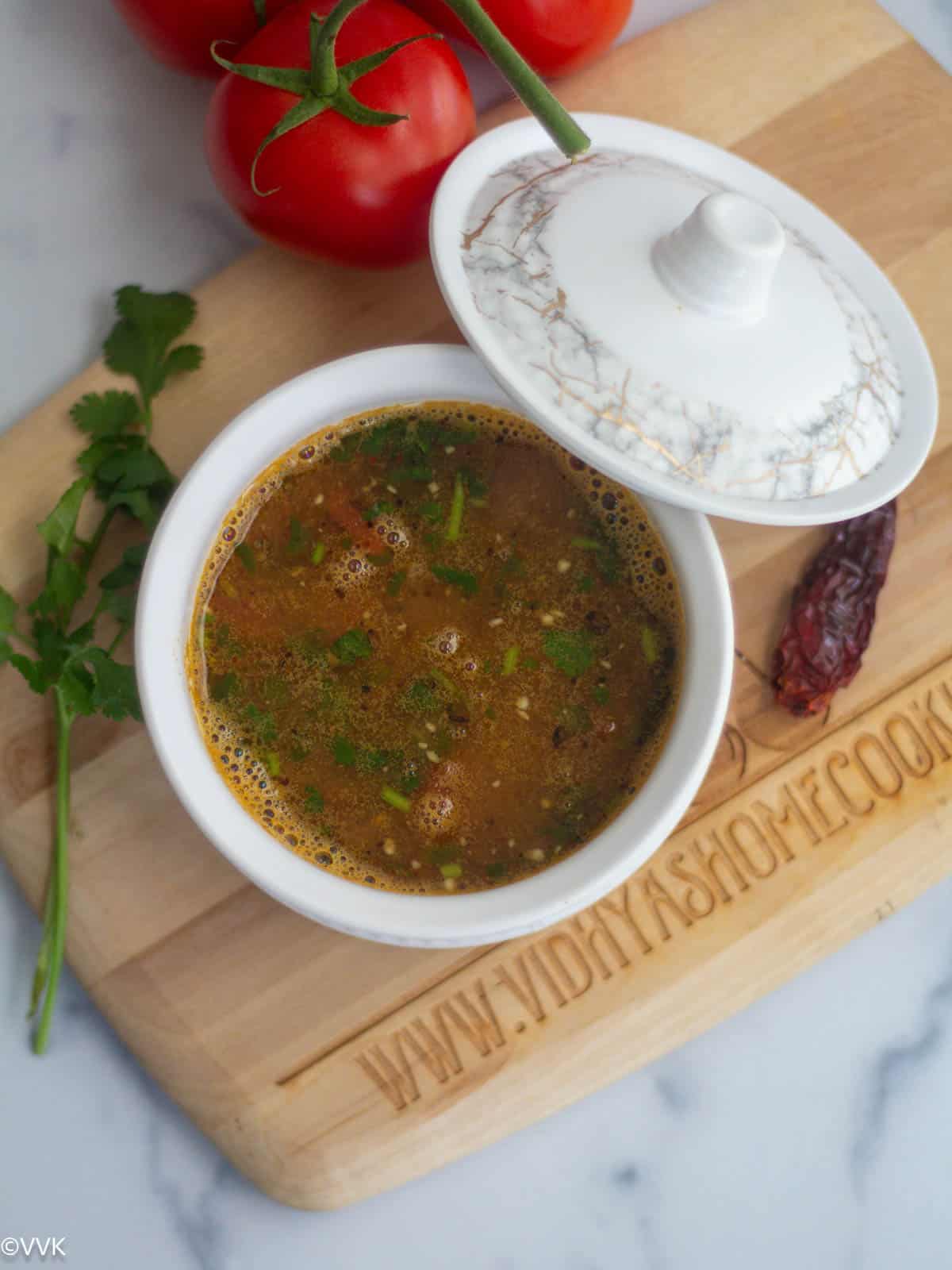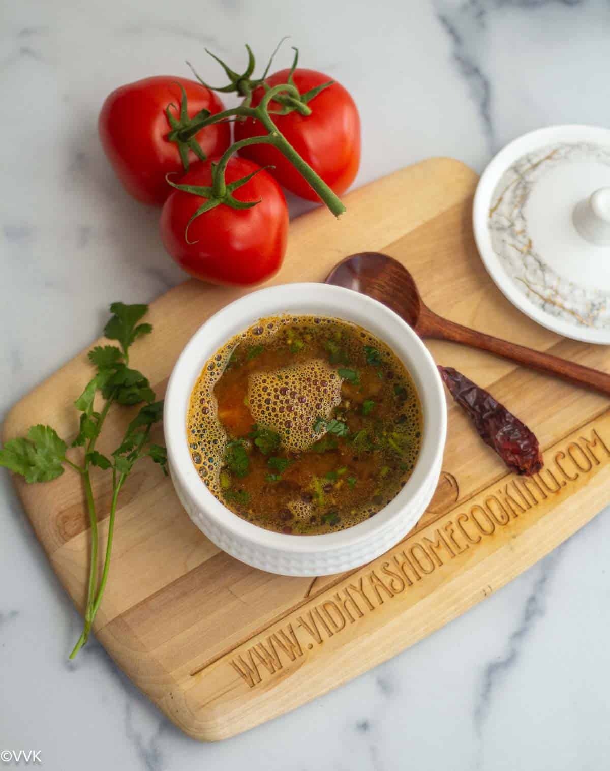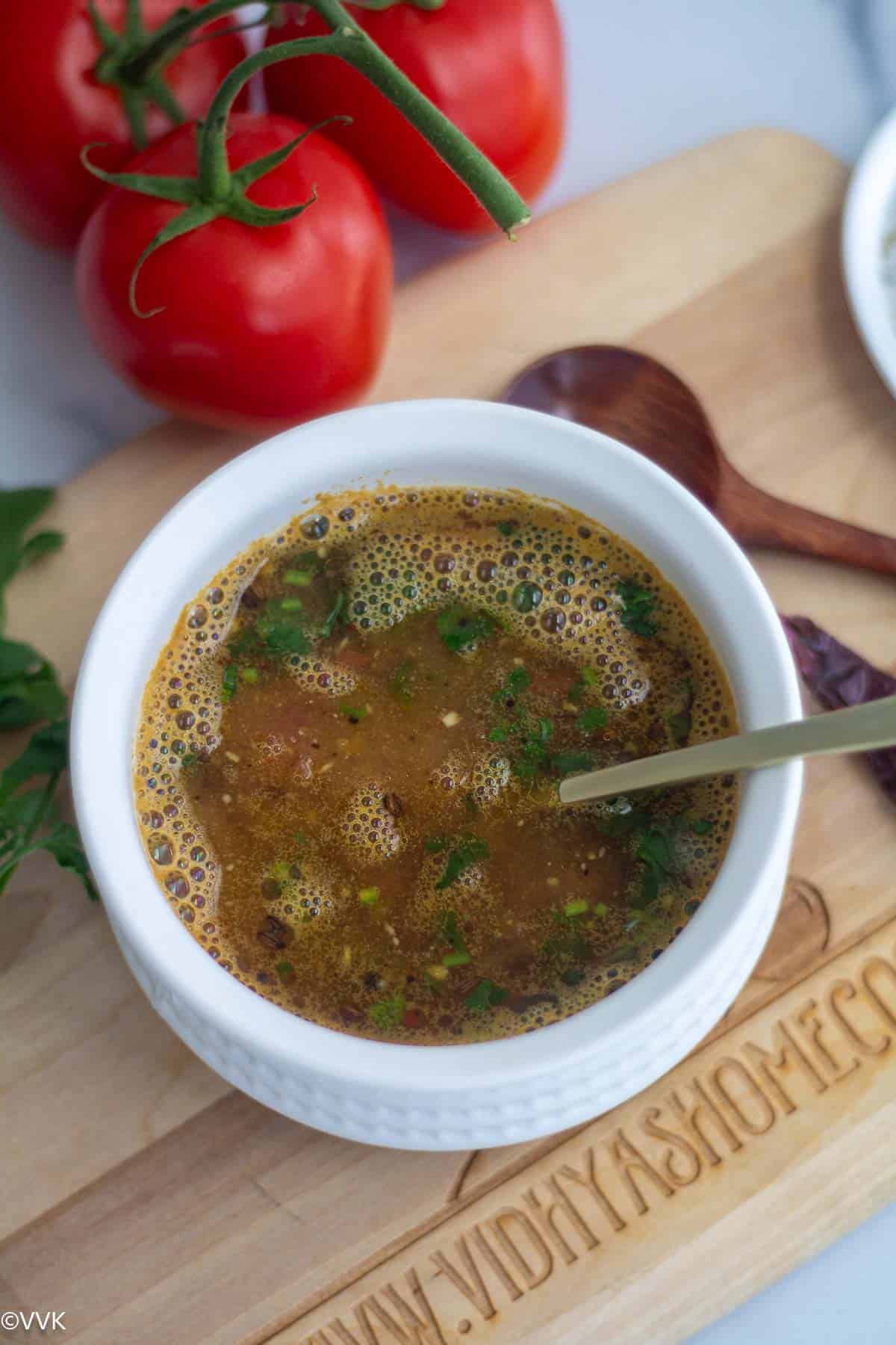 Plain and warm rasam is very soothing and comforting. Enjoy it as a soup with a side of papad.