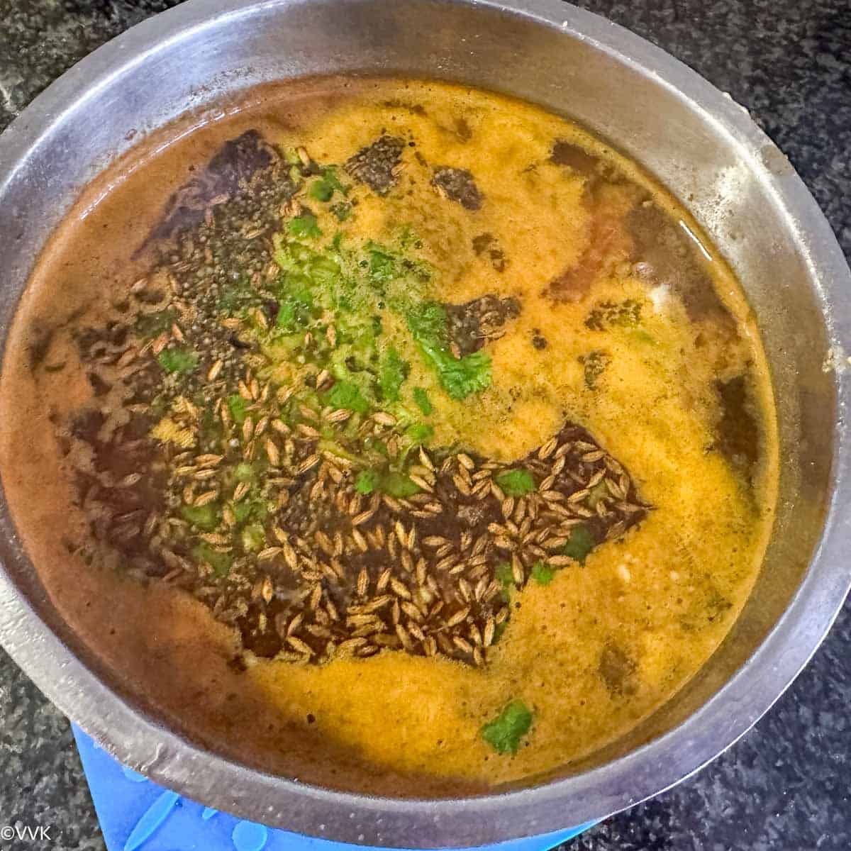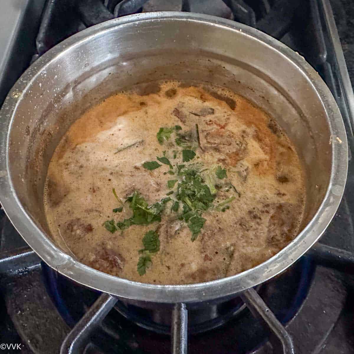 - Now add the ground paste, rinse the mixer jar with ½ cup of water, and add that. Mix and simmer again for five mts. When it comes to gentle boil, add 1 tbsp of cilantro and let it simmer for a minute.