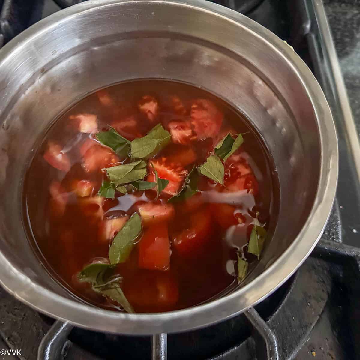- Add the tamarind paste/extract, chopped tomatoes, salt, curry leaves, and one cup of water to the saucepan. Mix well.