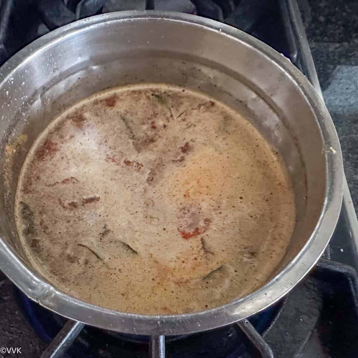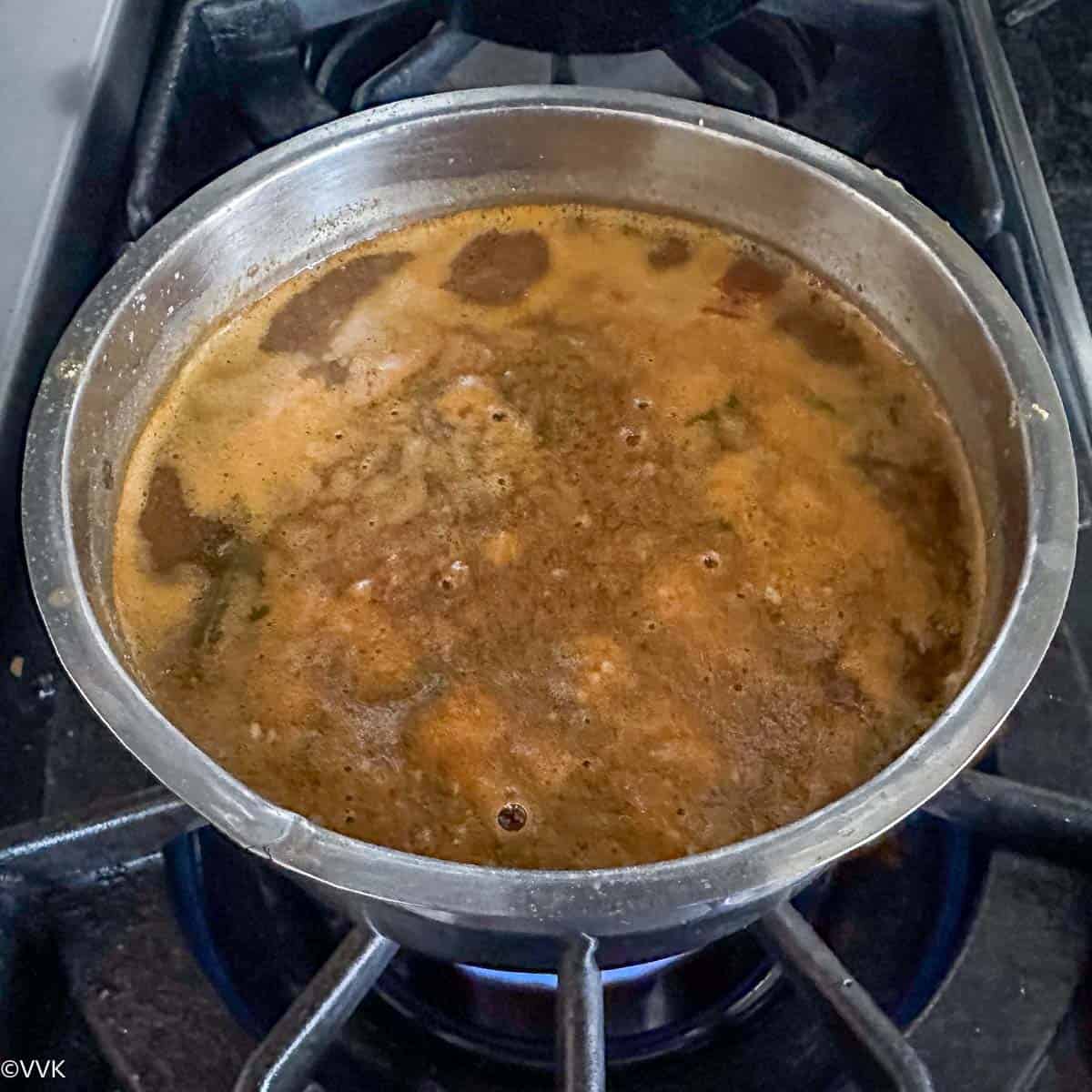 - Add the jaggery, reduce the heat to medium-low, and gently simmer the rasam. Do not let the rasam to boil. Once it becomes frothy, turn off the heat.