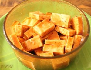 - Make sure all the tofu cubes are marinated and coated with the sauce.