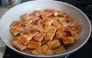 While searing the tofu cubes, do not add more than 3 tbsps of the sauce.
