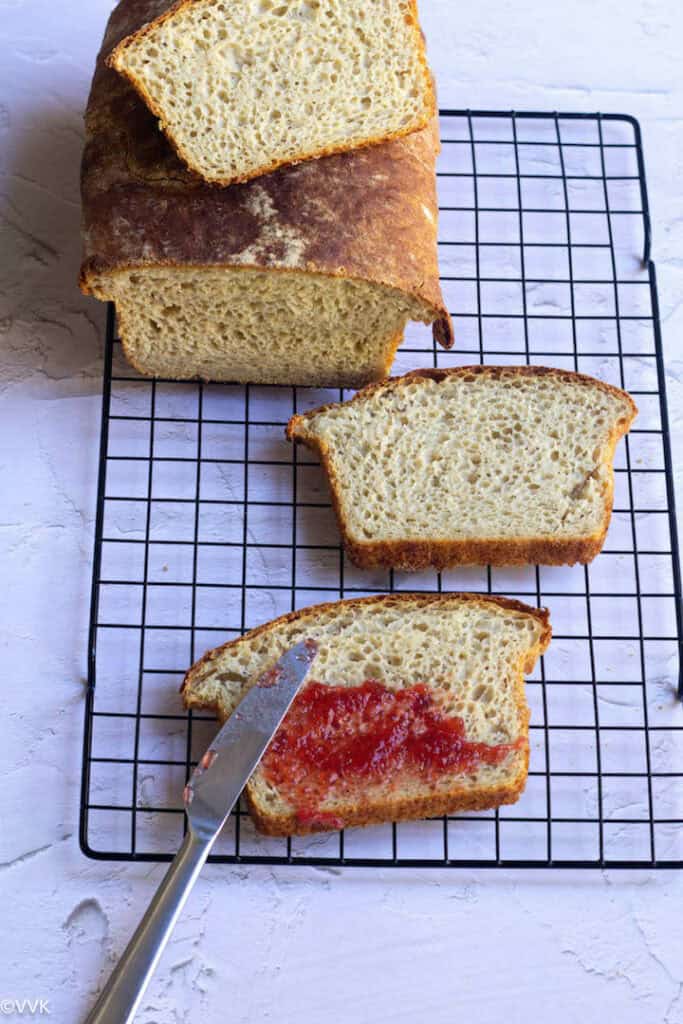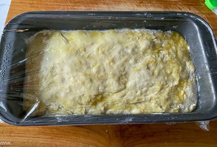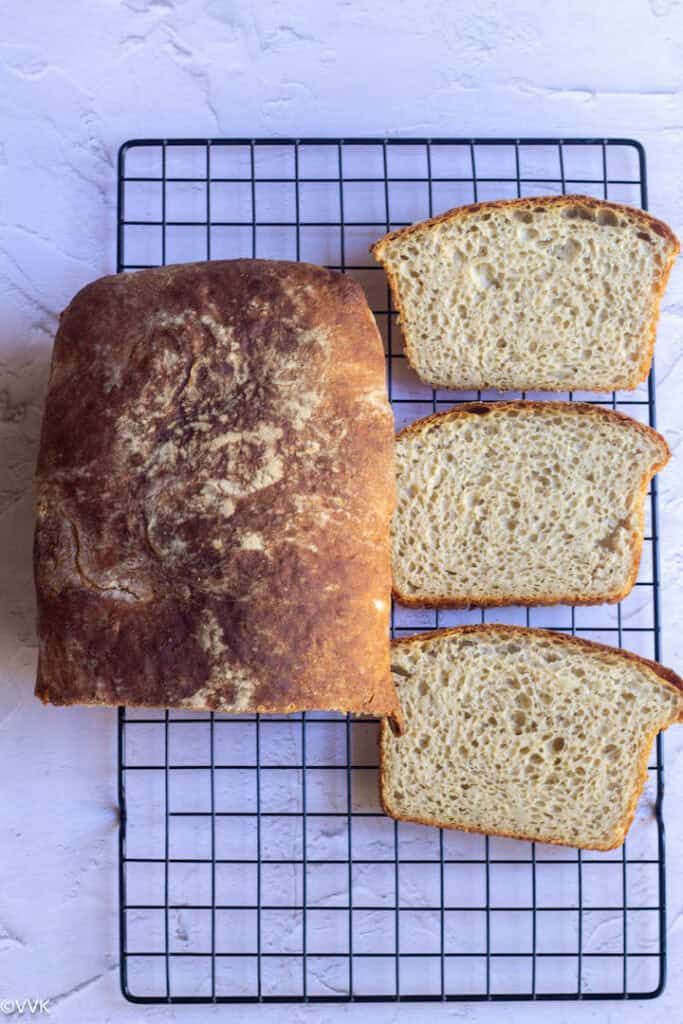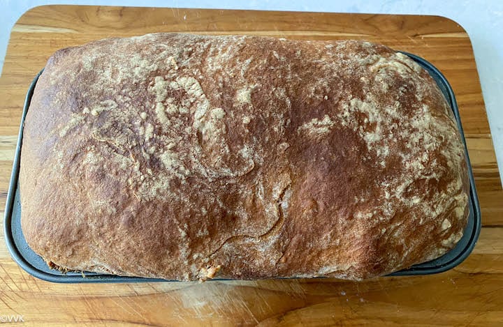 Most of the no-knead bread recipes call for a Dutch oven, but I baked this bread in the loaf pan following Varada’s instruction, and somehow I still bake this bread in a loaf pan even though I have a Dutch oven. It has always worked for me, and as I mentioned before, you don’t need any fancy gadgets for this bread. All you need is a mixing bowl, cling film, or wrap and loaf pan. I used my 9X5 inch loaf pan.