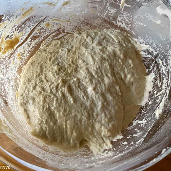 - Wet your palms and mix the dough gently. Fold it a couple of times, and again no need to knead.