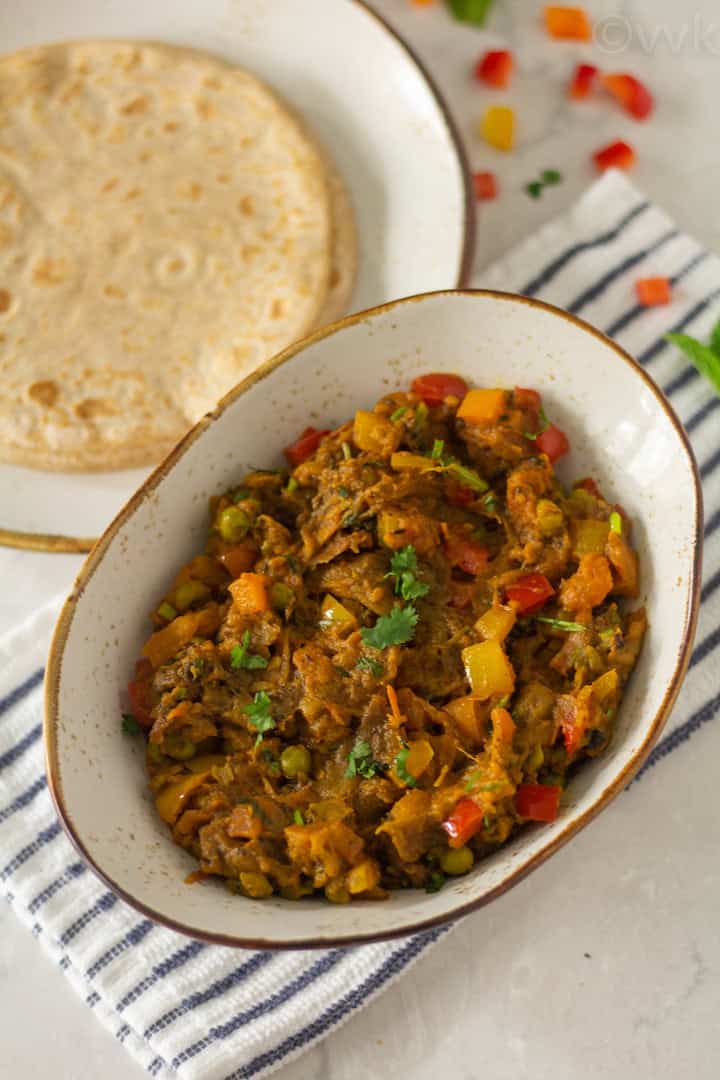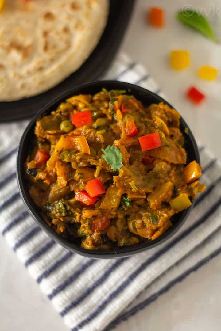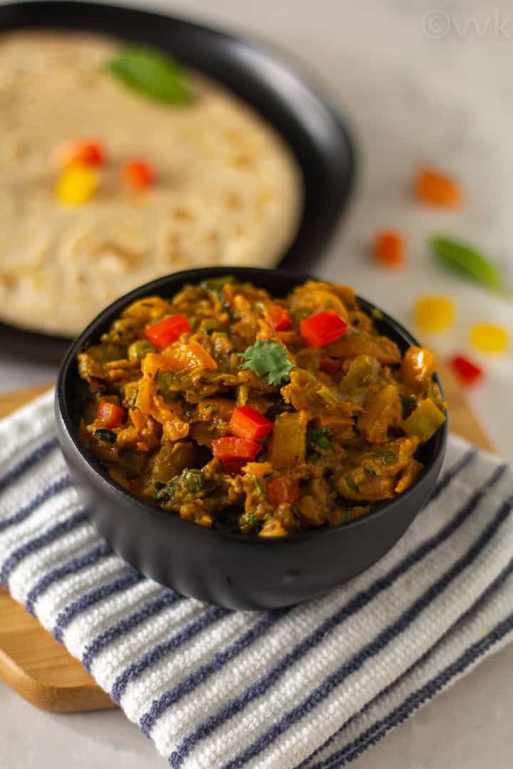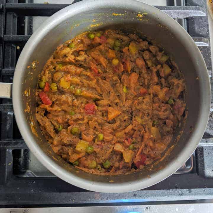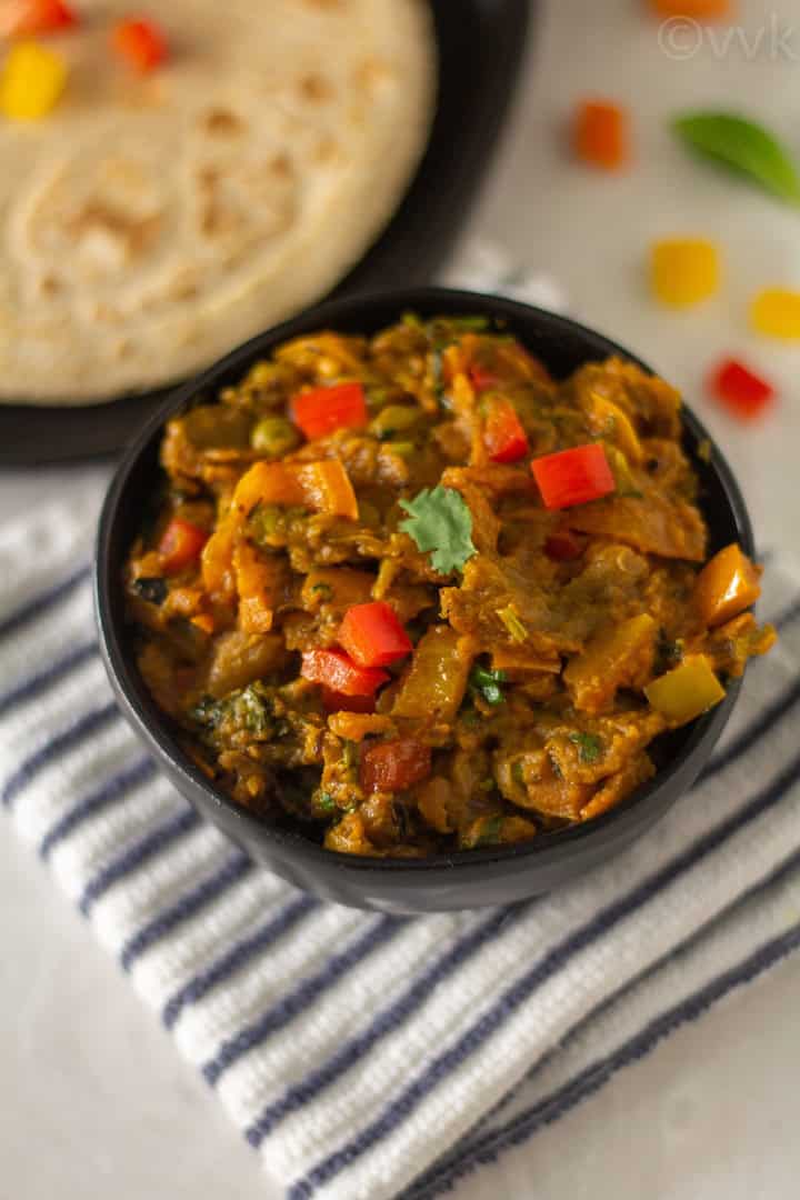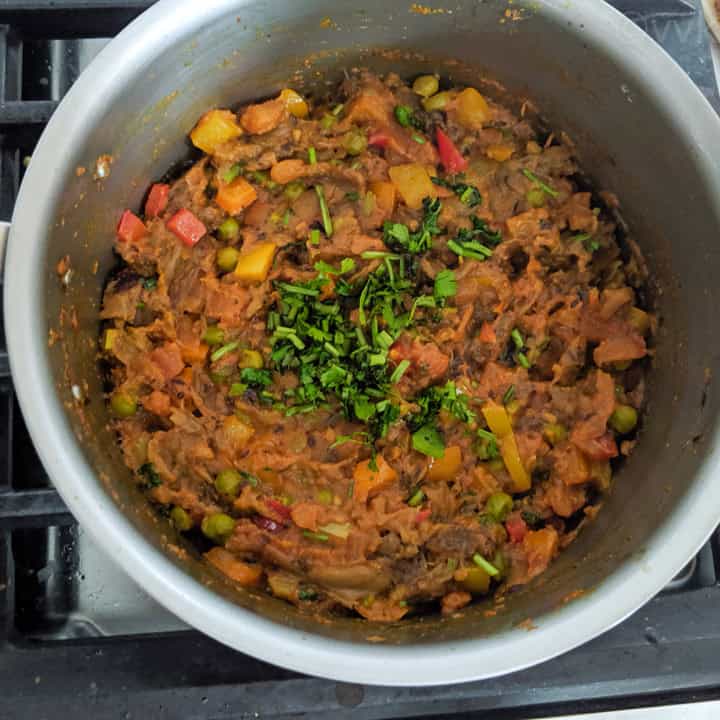 Also, along with baingan, I add colored peppers and peas to make the dish more colorful and flavorful. The sweet from the peppers gives a lovely flavor and texture. The traditional or the authentic version doesn’t call for these two. But I always add them to my bharta.