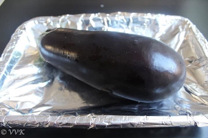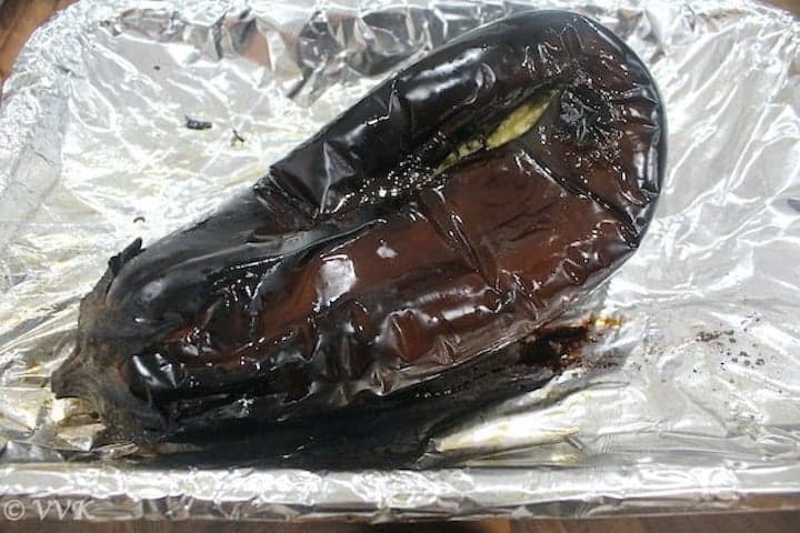 For me, roasting the brinjal was difficult initially, but when I started using the oven, it became effortless, and this dish became one of the staple dishes in our house. Like I mentioned in the eggplant raita post, I broil it in the oven. But you can very well roast the eggplant on the direct flame as well.