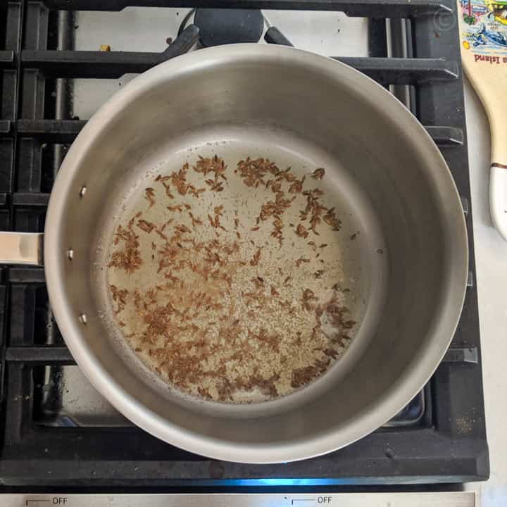 - When the oil is hot, add the cumin seeds and asafoetida. Let it sizzle.