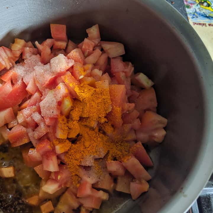 - Next, add the chopped tomatoes, salt, and turmeric powder.