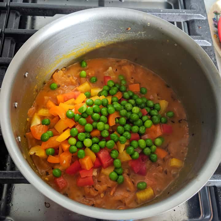 - Add this stage, add the chopped peppers and peas and cook for 3 to 5 minutes.