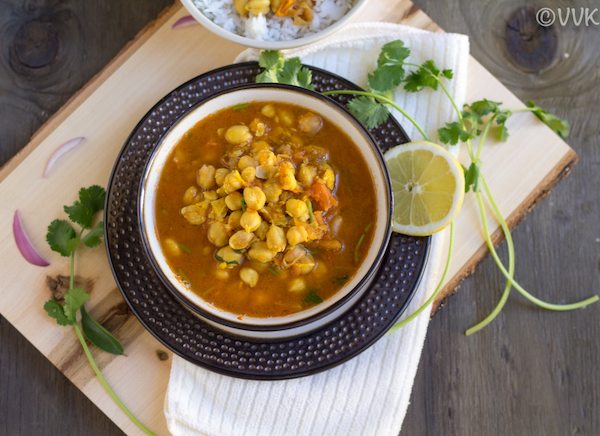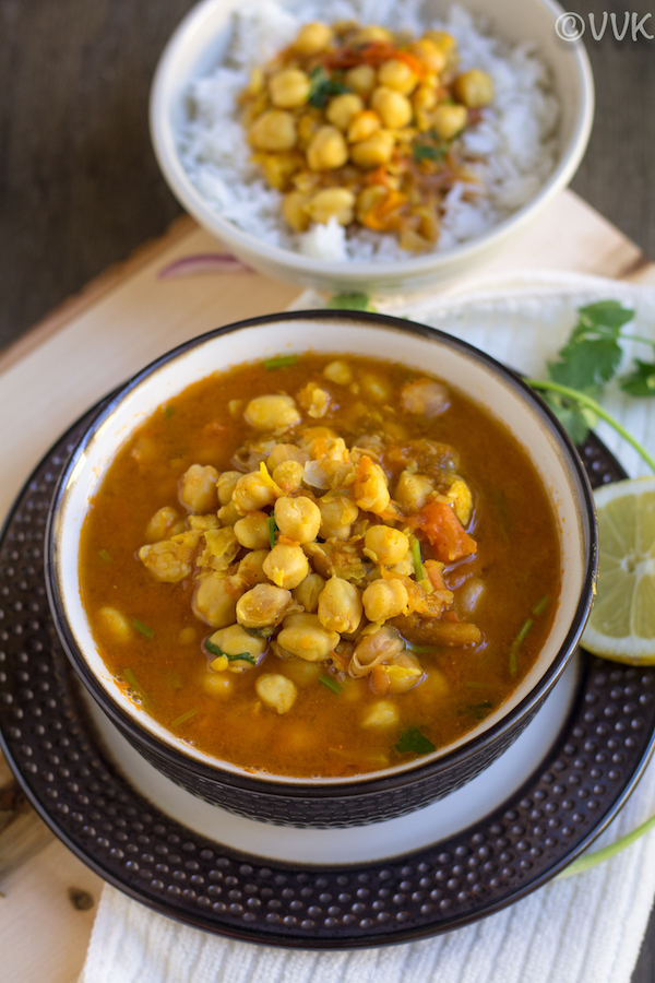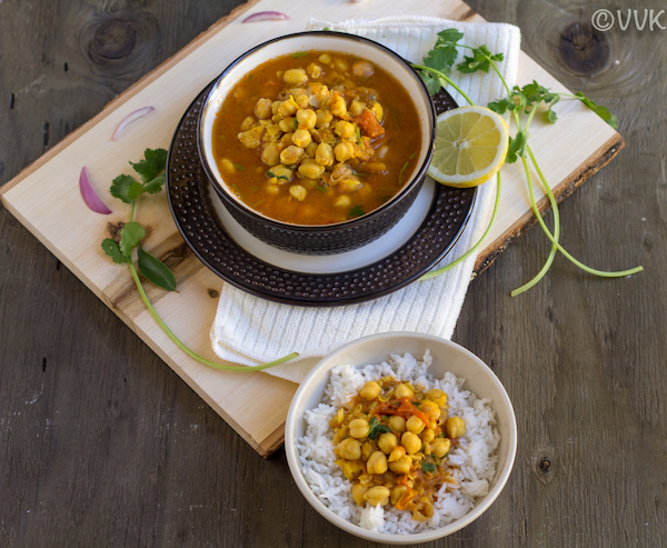 In this recipe, along with garbanzo beans, I have included Bengal gram as well. One of our friends suggested, and when I tried, we liked the flavor and texture. From then on, every time I make the curry without onion or garlic, I include channa dal as well. But it is entirely optional.