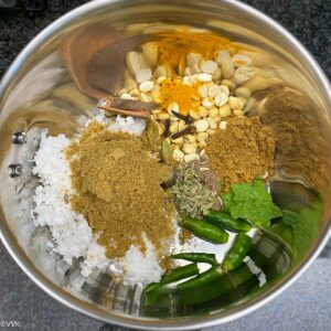 For the masala – We use coconut, cinnamon, cardamom, cloves, cumin powder, coriander powder, roasted gram/pottukadalai, green chilies, fennel seeds, mint leaves, and turmeric powder to prepare the masala. I usually add all the spice powders and blend them too.