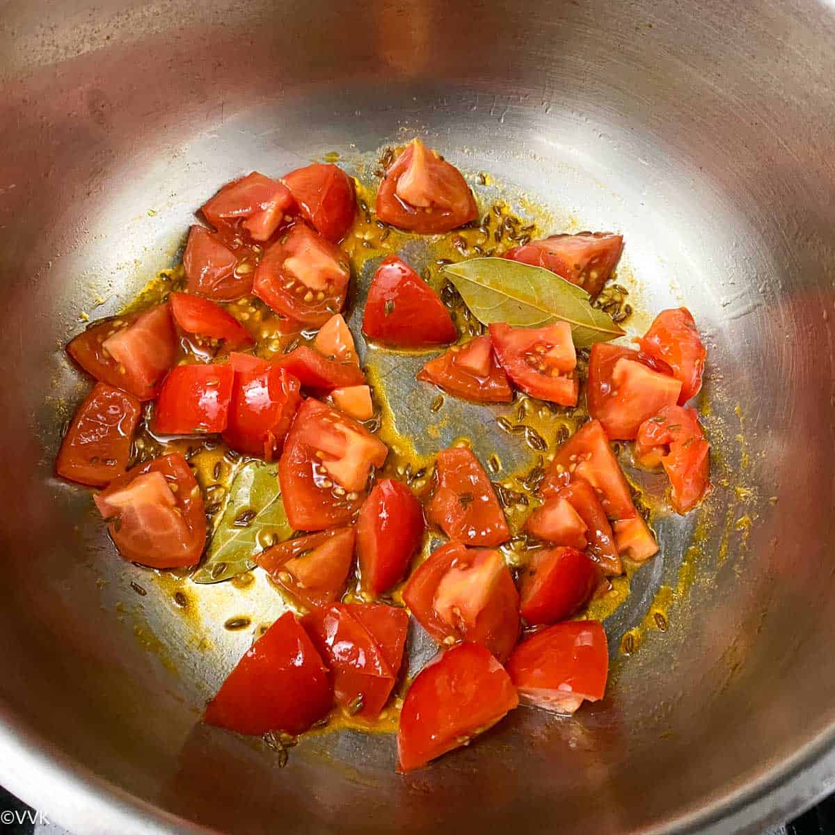 - Heat the pressure cooker or pressure pan and add the oil. When the oil is hot, add the cumin seeds and bay leaves. Let the cumin seeds sizzle and add the tomatoes.