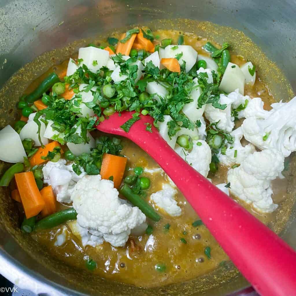 - Let the masala and tomatoes cook for 5 to 7 minutes or until the raw smell of the spices goes off. Make sure to mix the tomato-kurma masala in between. Now add all the vegetables and one tbsp of cilantro.