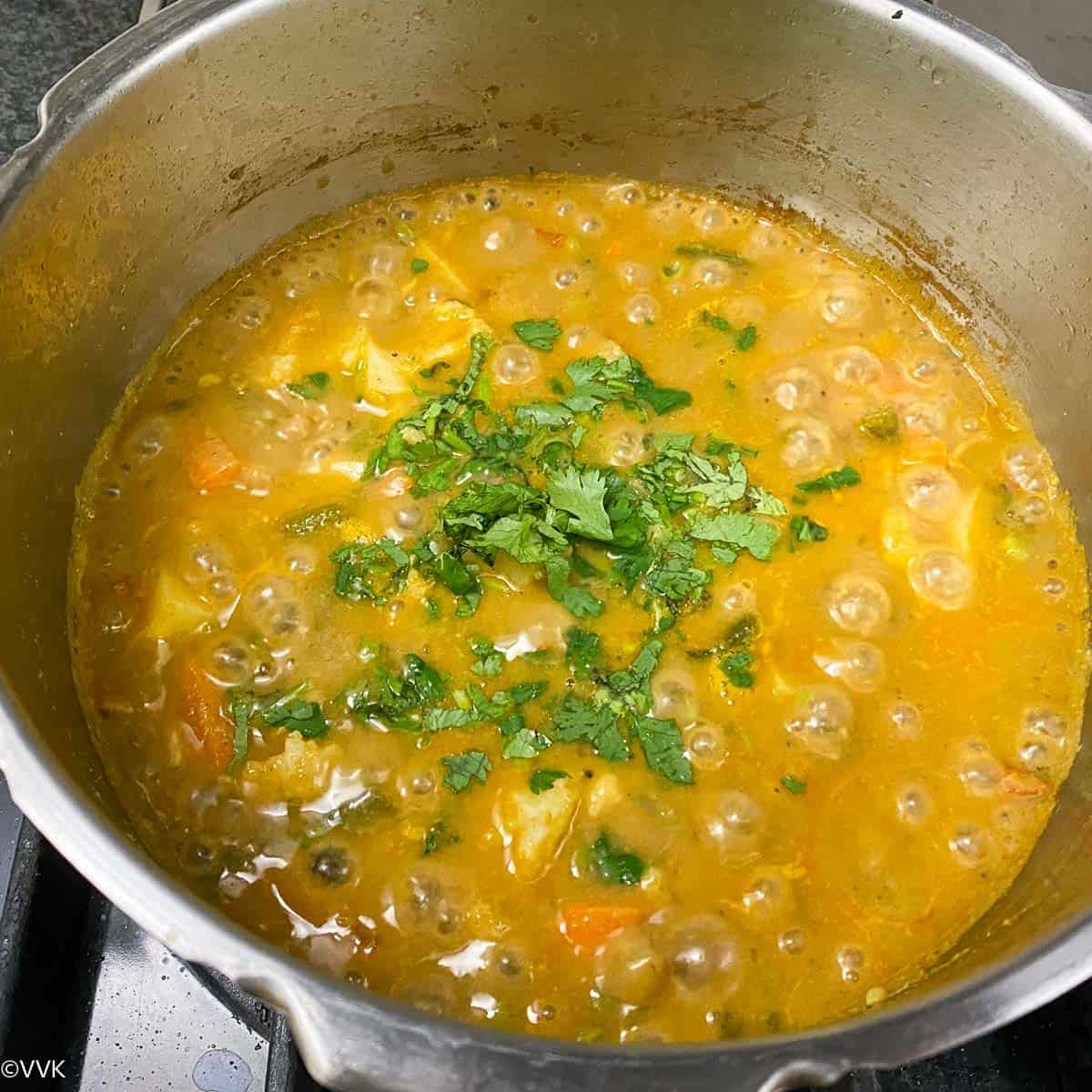 - Mix the ingredients well, and pressure cook the kurma for two whistles. Let the pressure subside naturally. When the pressure is all gone, open the pressure cooker and mix the kurma well. It’s optional, but I always add one more tbsp of cilantro and bring it to one boil. That’s it. Kurma is ready. Serve it with roti or pulav or dosa.