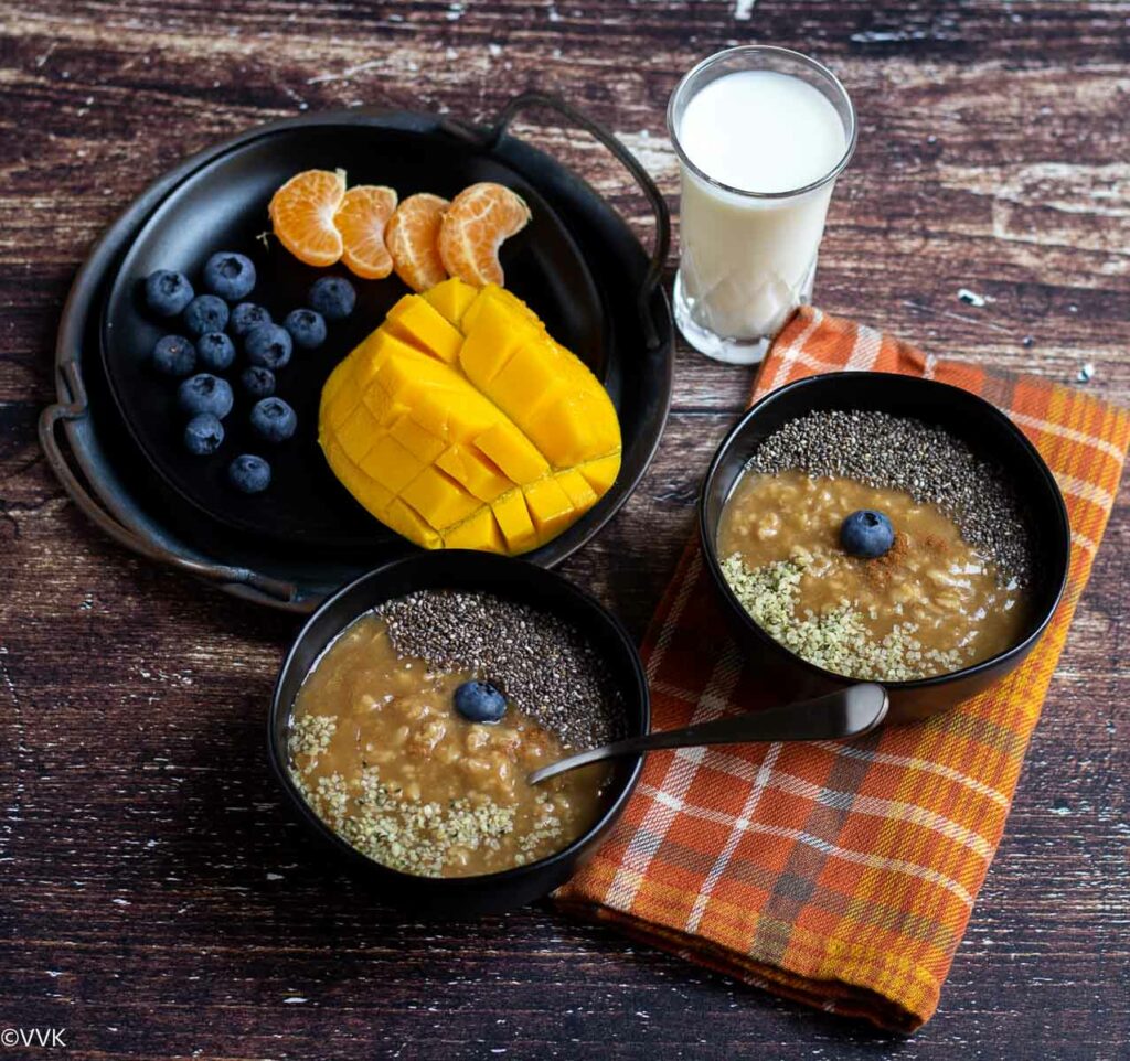 You might all wonder why I am using oatmeal and oats porridge in the title. Oatmeal is a type of porridge – a porridge made with oats. Sometimes I add more milk to my cooked oats and make it a thin porridge which I drink leisurely. For a savory version, I add buttermilk and salt. Yes, you can make sweet and savory porridge with oats, but today, let’s focus on the sweet one.