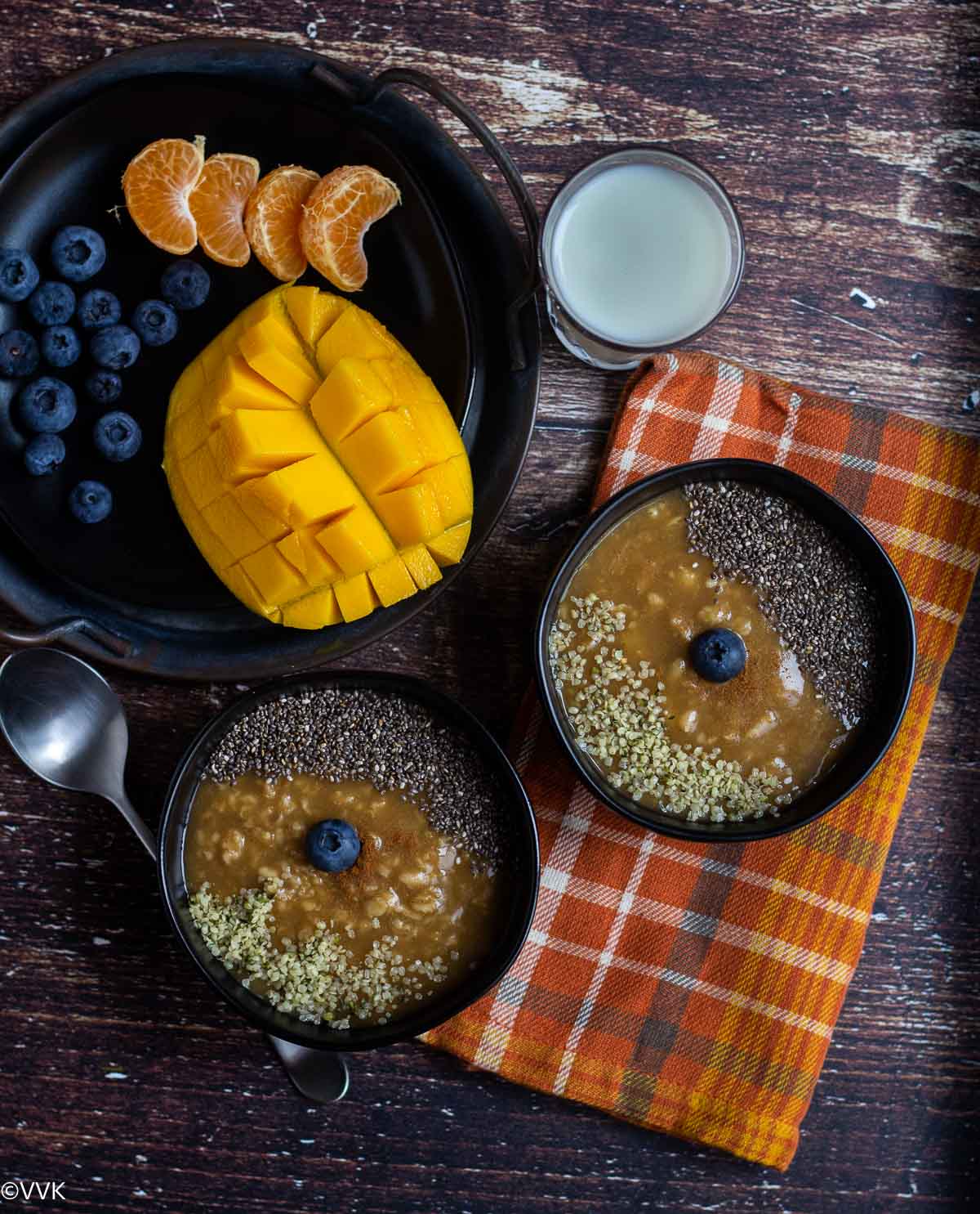 - Let it cool for 5 minutes. Now add the milk and mix. Divide equally between two bowls. Add the chia seeds and hemp seeds and serve warm with fruits of your choice. The oatmeal will thicken as it cools down.
