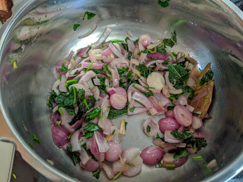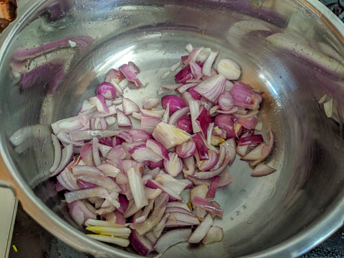 - In a pressure cooker or pan, heat the oil. When the oil is hot, add the bay leaf, chopped onion, and the shallots.