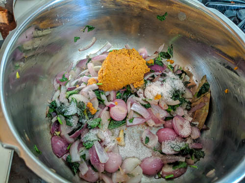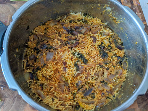 The spicy powder base sounds yummy and love that the garam masala spices went in there instead of tempering. Onions do add loads of flavor and this is a great one pot meal sans vegetables.
