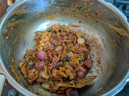 Even though I used store-bought dry spice powders, I blended it with coconut and shallots and then sauteed it. This ground masala infuses the flavor very well. The masala reminded of the theeyal masala but of course without fenugreek seeds.