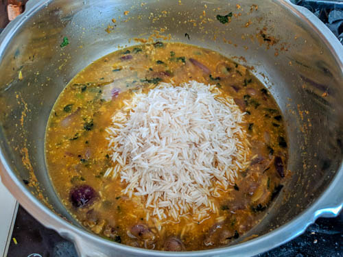 - Now add the water and the basmati rice. Mix gently and scrape the bottom if needed.