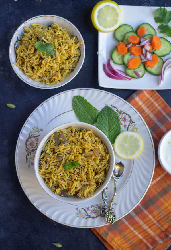 This biryani is unique, and it’s my favorite too. Are you wondering what makes it so unique? The shallots and coconut. I found different versions of this onion biryani on the internet but decided to make my version with coconut. I love coconut and adding coconut or coconut milk to pulav and biryanis enhances the flavor to a whole new level. (PS – I have one more biryani recipe coming up with coconut)
